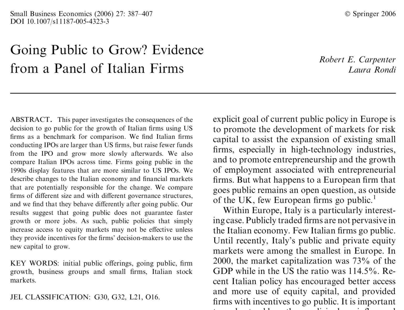 Penelitian ini membandingkan perusahaan-perusahaan yang go publik di Italia dan Amrik. Berdasarkan studi terdahulu, perusahaan amrik yang go publik didapatkan mereka tumbuh sangat cepat. Median (nilai tengah) aset perusahaan yang go publik tumbuh 3 kali lipat dalam 5 tahun setelah IPO, dan employment tumbuh 70% dibandingkan tahun ketika IPO (Carpenter dan Petersen, 2002).