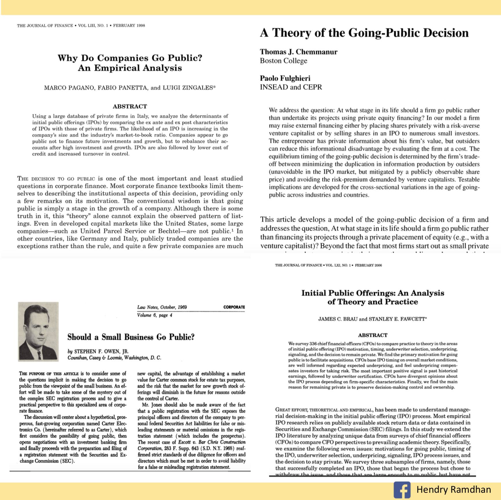 Dari beberapa referensi ttg keputusan Go Publik, ada yang membahas ttg stage kapan perusahaan yang tepat go publik, tapi ada pula yang membantah, stage itu tdk pengaruh, ada yang perusahaan besar tapi tetap private (tidak go publik) dan ada yang perusahaan kecil tapi go publik.