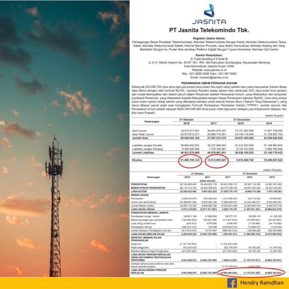 Namun kinerjanya 3 tahun terakhir masih merah alias rugi sejak 2015-2017. Daftar IPO dg buku keuangan oktober 2018, Jasnita akan resmi melantai esok hari, kamis 16 mei 2019.