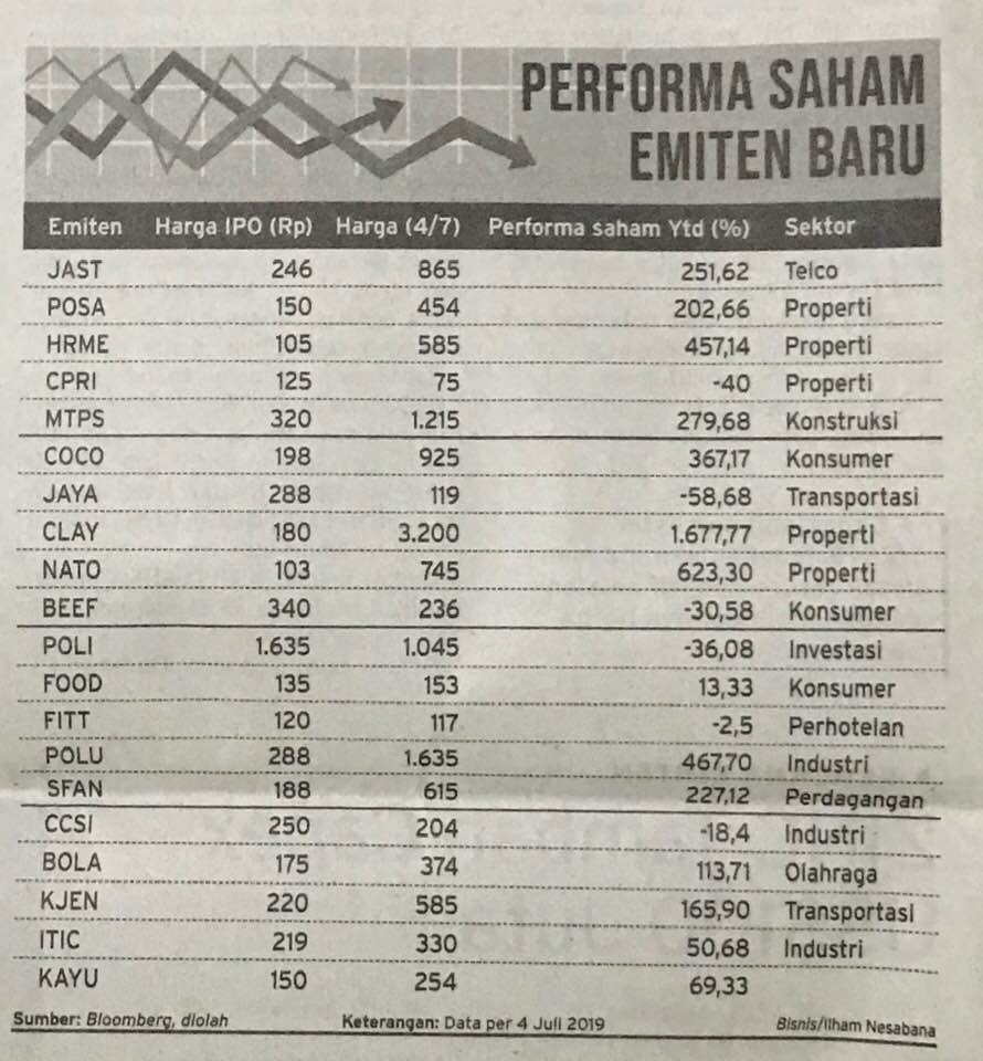 Dari 20 emiten yang sudah melantai sampai 4 juli 2019: