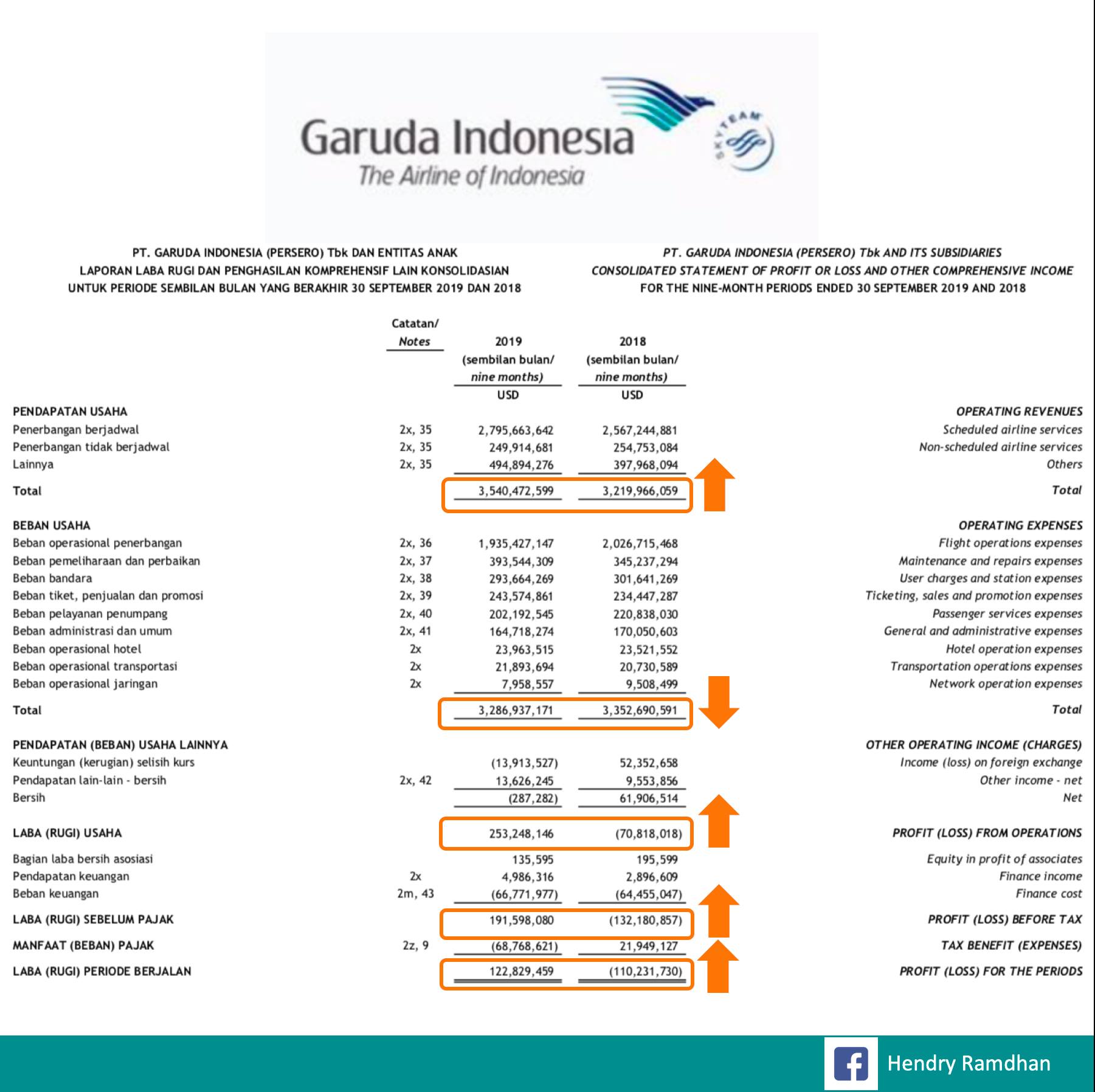 Bila diteruskan ke bawah, meskipun adanya Beban Keuangan Besar dan pembayaran Pajak, LABA periode 3Q di tahun 2019 Garuda positif 122 juta dolar dibandingkan 3Q 2018 yang rugi besar 110 juta dolar.