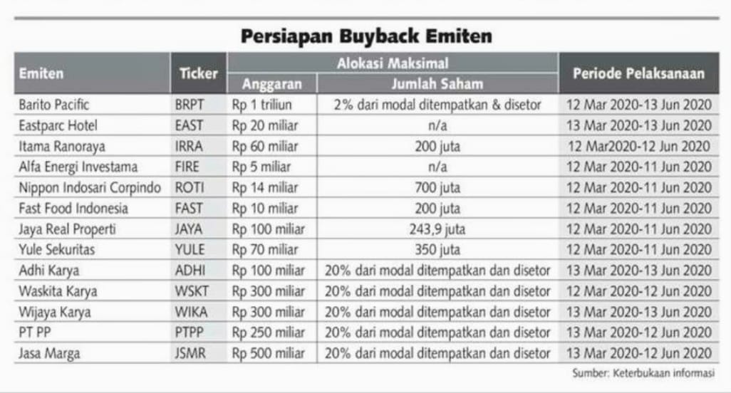 Dengan kejatuhan harga saham, emiten swasta juga berminat buyback. Salah satunya adalah Eastparc Hotel yang baru saja IPO di Juli 2019, harga IPO saat itu Rp 133 per lembar dan mendapatkan dana IPO Rp 54 milyar.